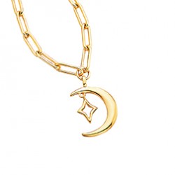 This necklace is an ode to the comfort and safety of a warm bed on a clear night. Dreams are all that await. A stylish "paper-clip" chain with the silhouette of the moon and star dangling so gently. Adjustable length 18" to 20".