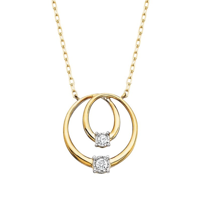 Two diamonds in an illusion setting equaling .05tw accent two romantic gold looping circles. Let the eternity of a circle encompass the eternal meaning of your love with this 10k yellow gold pendant.