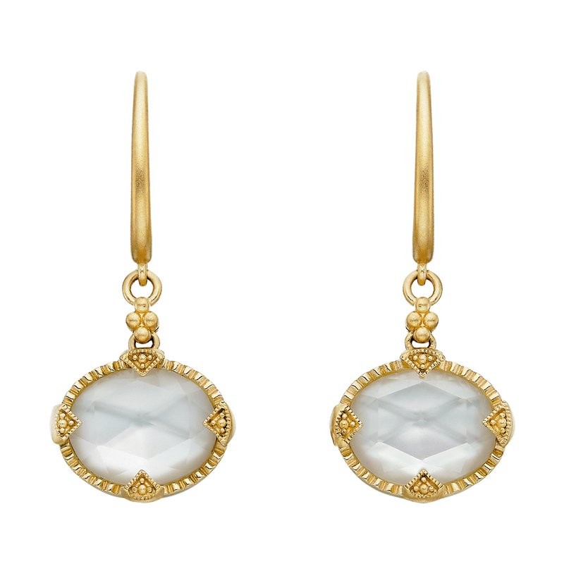These exquisite 14-karat yellow gold Etruscan-inspired drop earrings each feature a luminous, horizontally set rose-cut oval mother-of-pearl and rock crystal doublet. Their design is elevated by rich textural details and a sophisticated soft matte finish, blending ancient allure with modern craftsmanship. Matching ring B3349MPD and pendant B3350MPD are available.