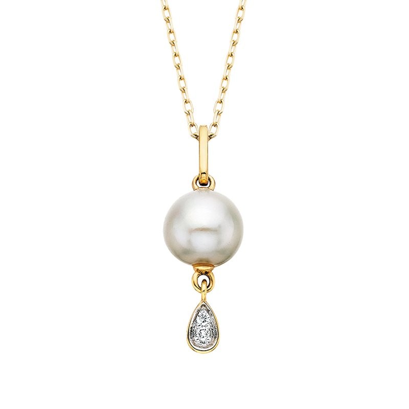 A luminous pearl glows at the heart of this classic pendant. A delicate teardrop cradling two twinkling diamonds dangles from the pearl, adding extra grace and movement. Total diamond weight is .02ct.