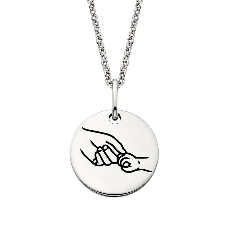 This exquisite round sterling silver disc pendant features a beautifully etched design of a mother, and child's hands clasped together, symbolizing the unbreakable bond of love and connection between them. Inscribed on back, "I may have given you life, but really, you gave me mine".