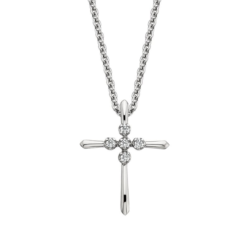 This delicate 10-karat white gold cross is a beautiful symbol of faith, subtly enhanced by a touch of sparkle. It features .05 ctw of diamonds, exquisitely arranged to illuminate the apex of the cross.