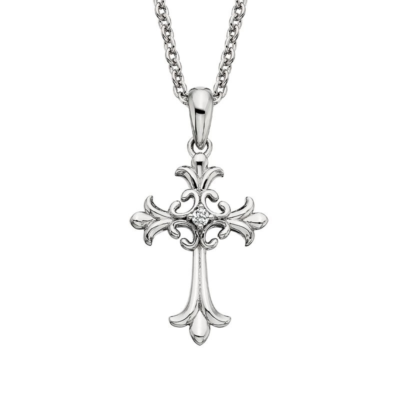 This stunning sculptural sterling silver cross draws inspiration from the graceful fleur-de-lis. Accented by a brilliant white topaz, its refined design offers an elegant and symbolic statement piece.
