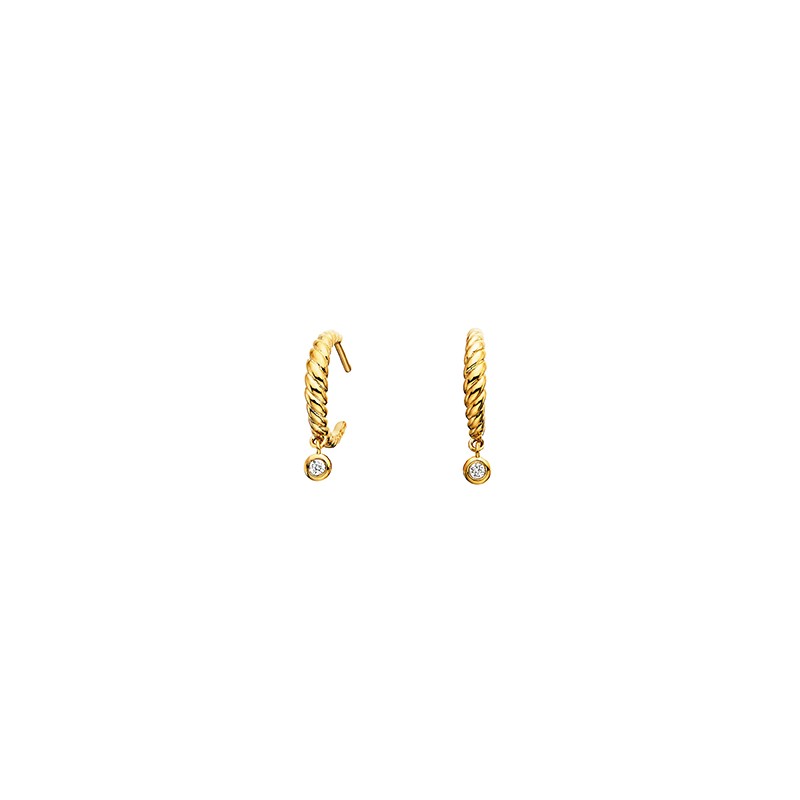 Looking to change up your everyday hoops? Try our 1/2 micron yellow gold over silver croissant hoop earrings with .06tw bezel set round diamond drops.