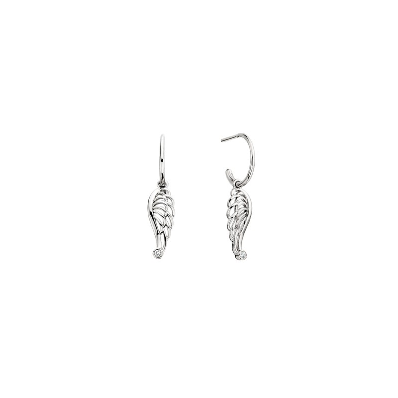 Stay stylish in silver with our mini hoop earrings with a beautiful angel wing charm with .03tw sparkling bezel set diamond accentsSS - A2028D