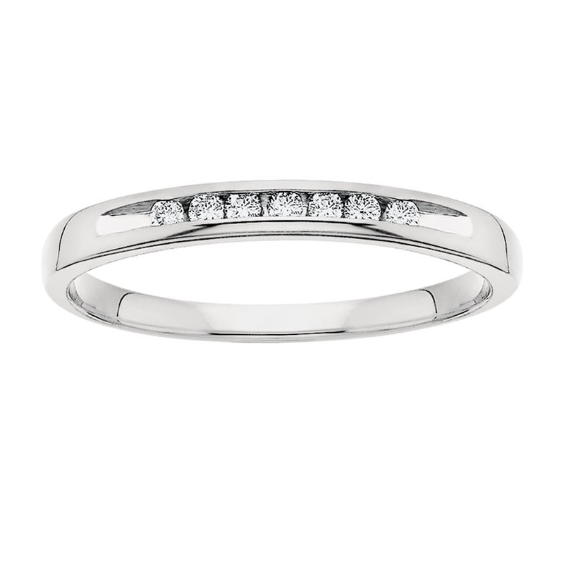 Lovely 14kt white gold diamond celebration ring with seven channel-set diamonds, 1/10cttw. Comfort fit.