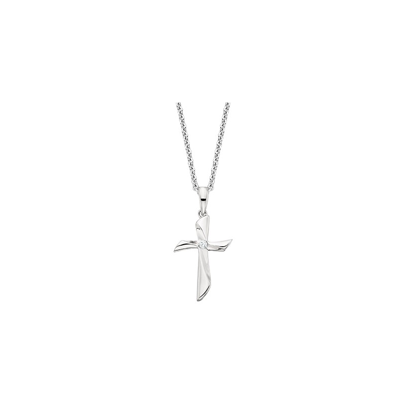 Ladies’ wave cross pendant in sterling silver with a .03ct solitaire diamond set into the center. 18" chain included.