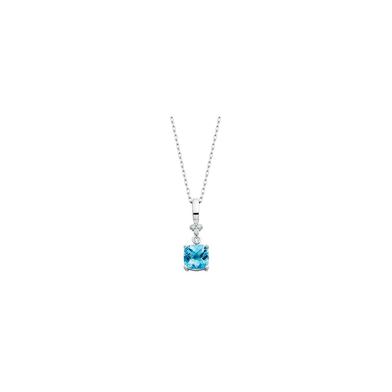 A luscious Blue Topaz cushion cut solitaire pendant is set in 10kt white gold. Completed by an accent of .03tdw of diamonds for extra sparkle.