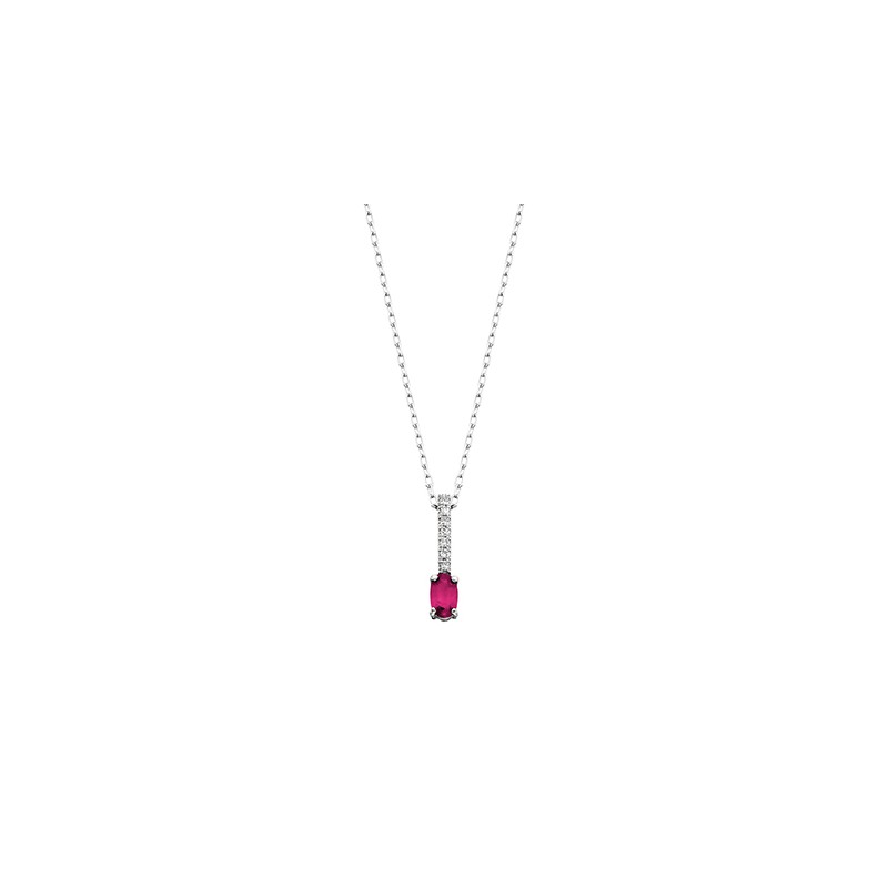 Crafted in 10K white gold, an oval cut ruby hangs from a .04tdw pave diamond bail, celebrating the fiery red and romance of the ruby gemstone.