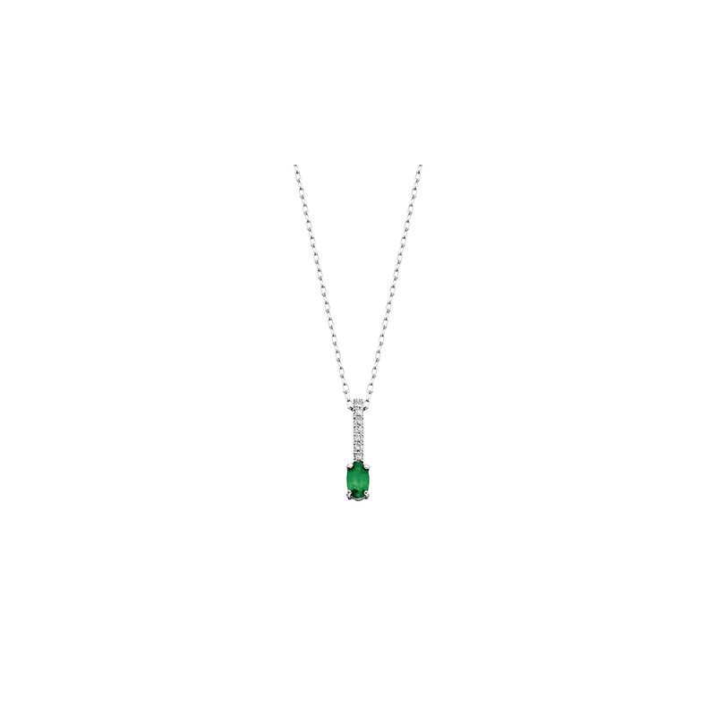 Fashioned in 10K white gold, an oval emerald hangs from a .04tdw pave diamond bail, celebrating the powerful nature of the emerald gemstone.