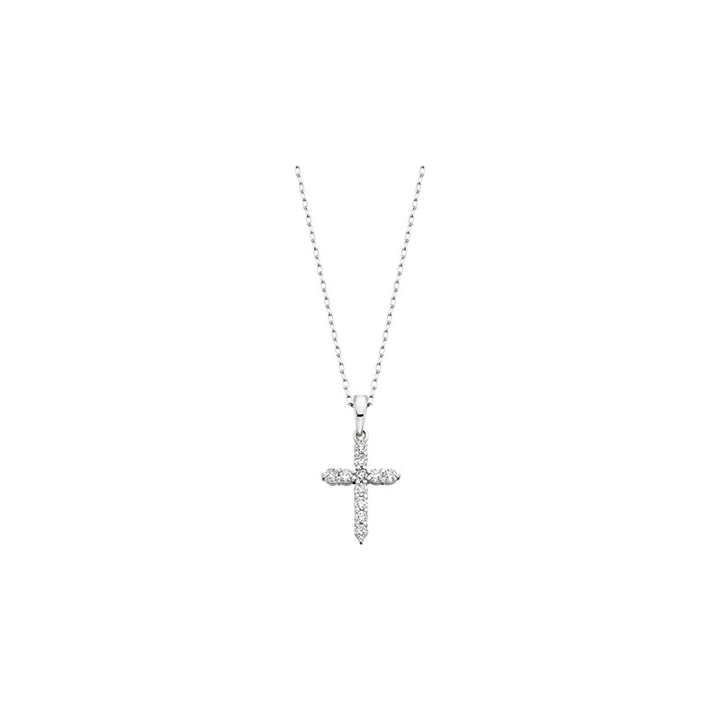 .11tw of brilliant round diamonds set in sparkling 14K white gold serve as a delicate symbol of your faith. Includes an 18" cable chain.