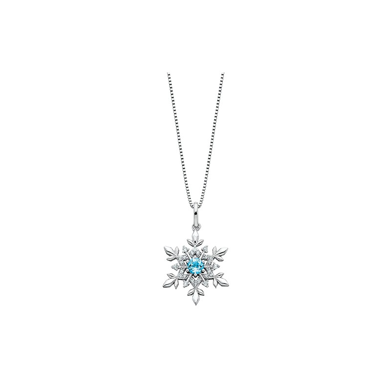 This sweet sterling silver snowflake pendant is accented with shimmering white topaz. At the charm's center, a large icy blue topaz creates a wintry glow.