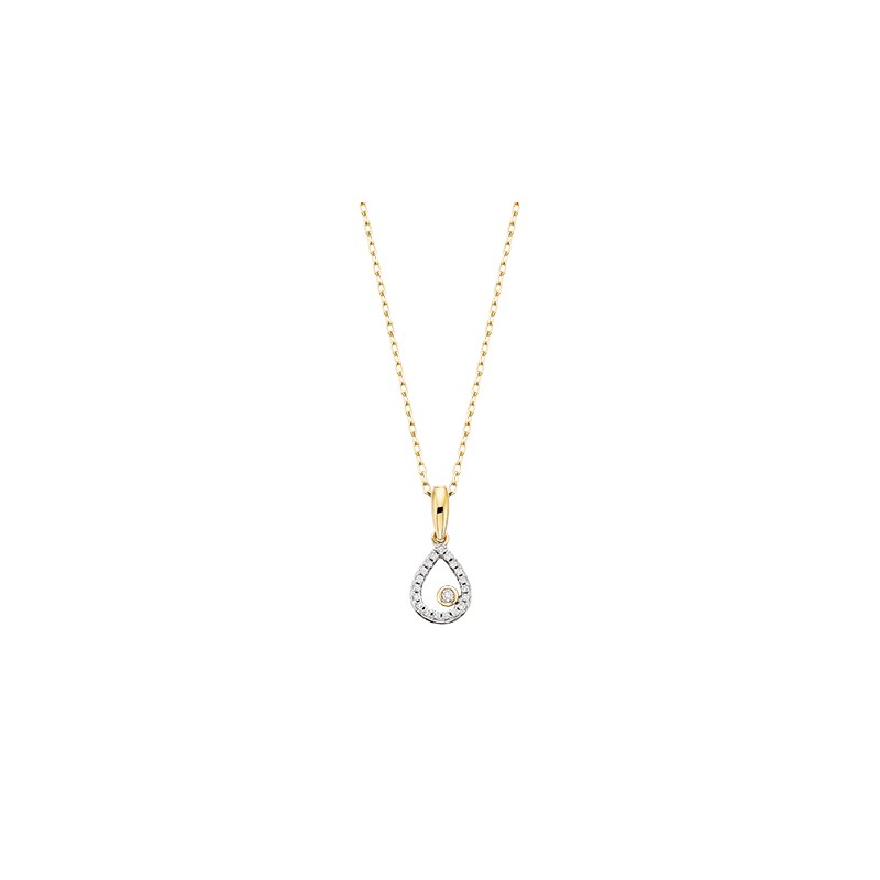 Delicate, easy to layer, and very much in style, this 10k yellow gold pear-shaped pendant catches the eye and holds it. Set with .06tw round diamonds. Also available in white gold.