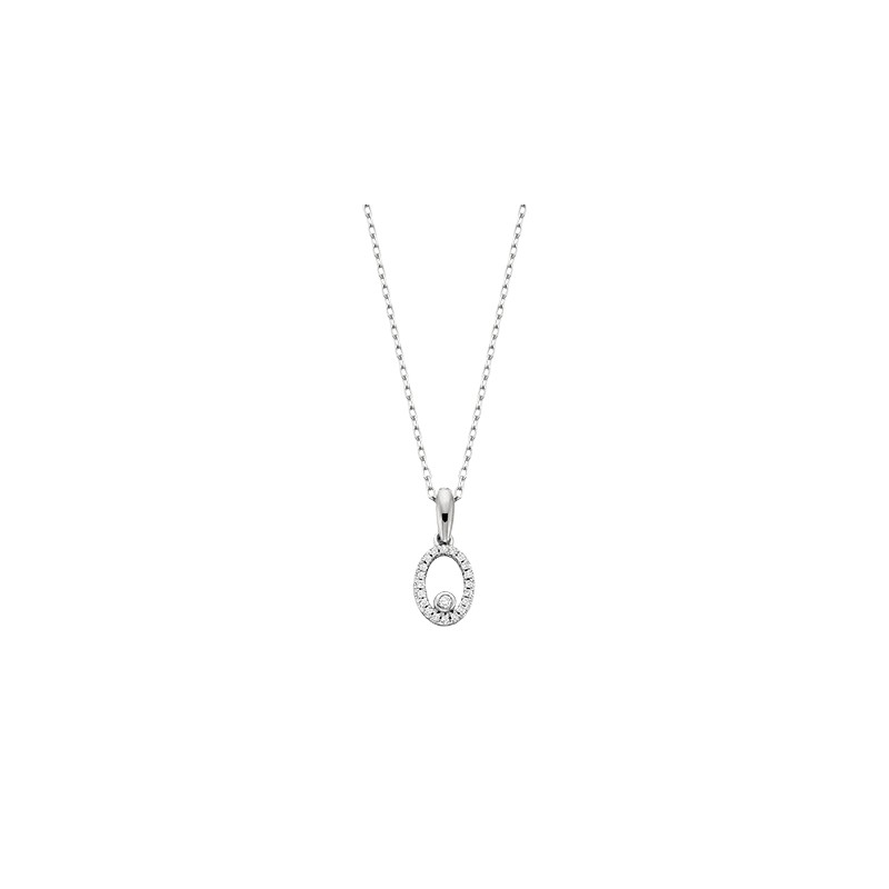 Delicate, easy to layer, and very much in style, this 10k white gold oval-shaped pendant catches the eye and holds it. Set with .06tw round diamonds. Also available in yellow gold. Matching ring available, D89.
