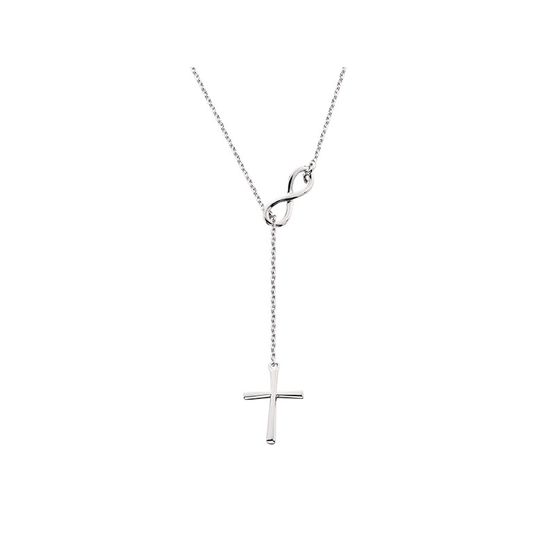 Infinitely wearable, playfully versatile, our sterling silver lariat Y-necklace pairs the infinity symbol with a simple, striking cross. 18 inches.