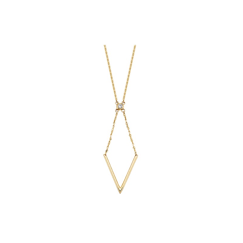 This delightful 10k yellow gold necklace boasts a .02ct diamond set above a unique dangling chevron shape. Bring your jewelry game beyond the ordinary.