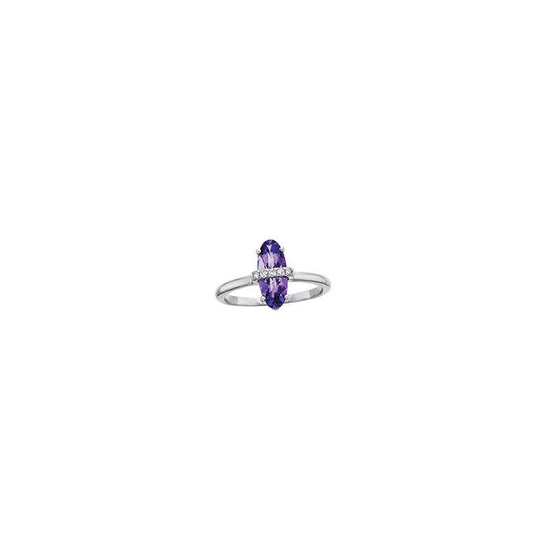 Personality and color abound in this 14K white gold ring, featuring an elongated checkerboard oval-cut amethyst. A belt of five shimmering diamonds cradles the rich purple stone. Total diamond weight is 0.05 ct. Total diamond weight is 0.05 ct.