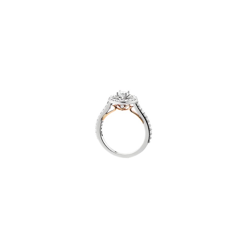 This striking 14k white gold halo engagement ring features a rose gold gallery accented with side diamonds. Simple filigree detail pairs with .60tw round diamonds on the shank as well as surrounding a .40 center stone. Matching wedding band available, D31.